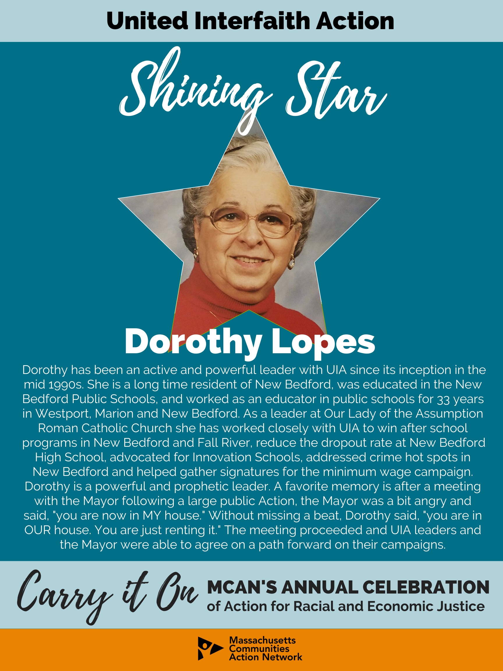 United Interfaith Action is one of seven affiliates of the Massachusetts Communities Action Network (MCAN) working across the Commonwealth for racial equity and economic justice. Each year, MCAN honors a shining star from UIA(pictured below) and each of our sister affiliates.
